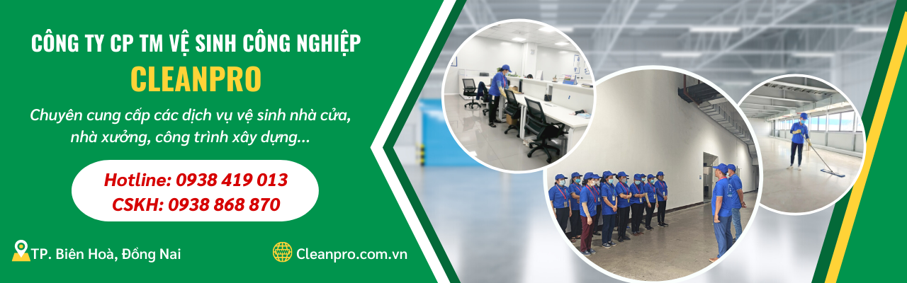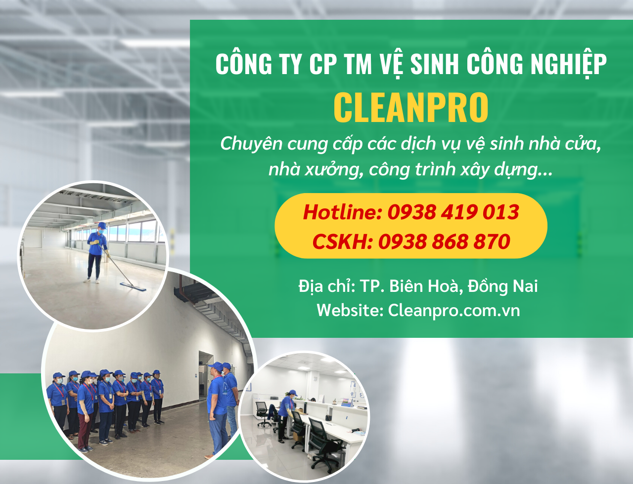 Công ty Cổ phần Thương mại vệ sinh công nghiệp Cleanpro là doanh nghiệp hàng đầu hoạt động trong lĩnh vực vệ sinh công nghiệp, đặc biệt là vệ sinh tòa nhà văn phòng, nhà xưởng, công trình xây dựng, vệ sinh định kỳ máy móc, các trang thiết bị nhà xưởng, khử trùng, khử khuẩn, cung cấp nhân lực tạp vụ, cung cấp và chăm sóc cây cảnh…